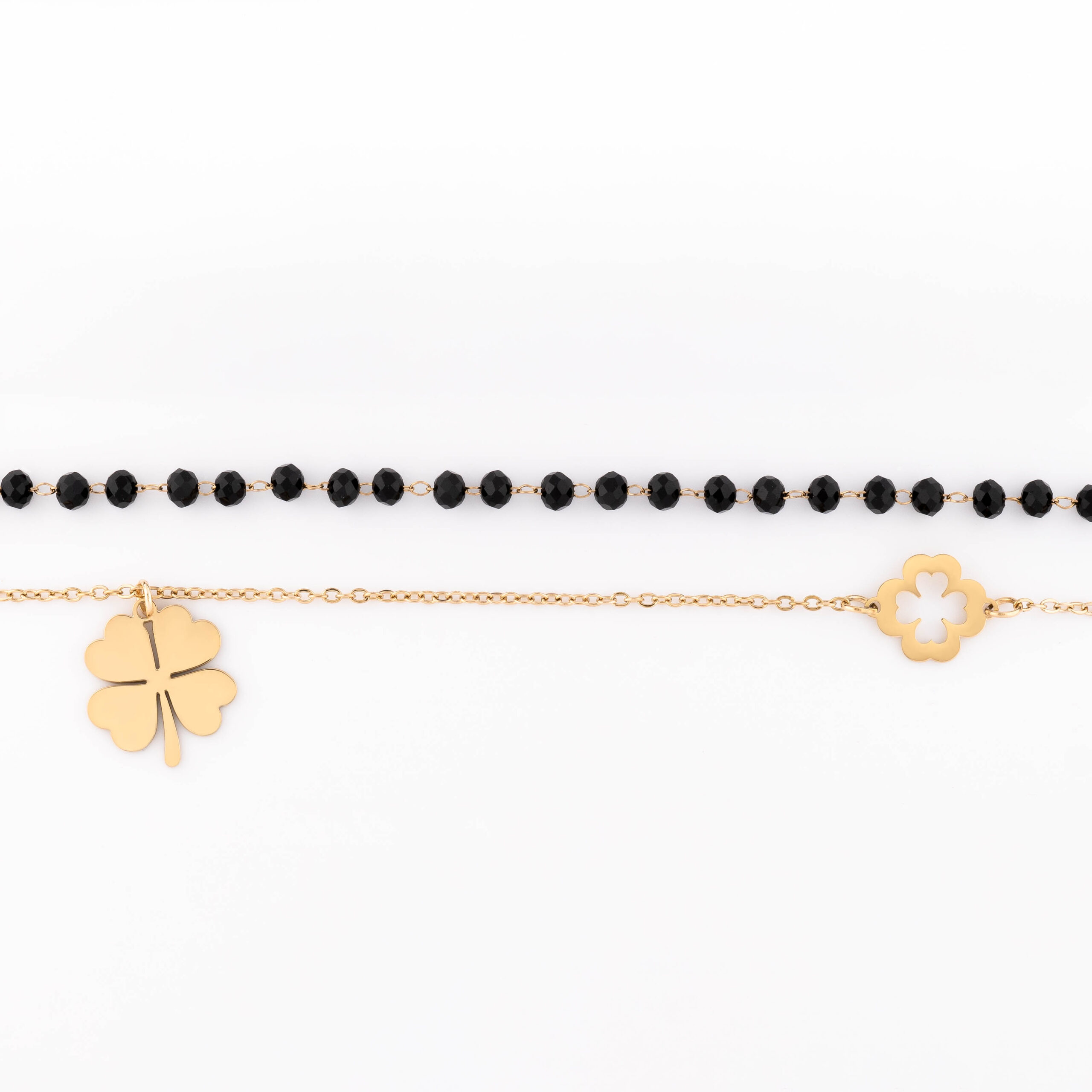 Bądź pierwszy, który oceni “Bransoletka podwójna z czarnymi koralikami i dwoma zawieszkami w kształcie czterolistnej koniczyny”