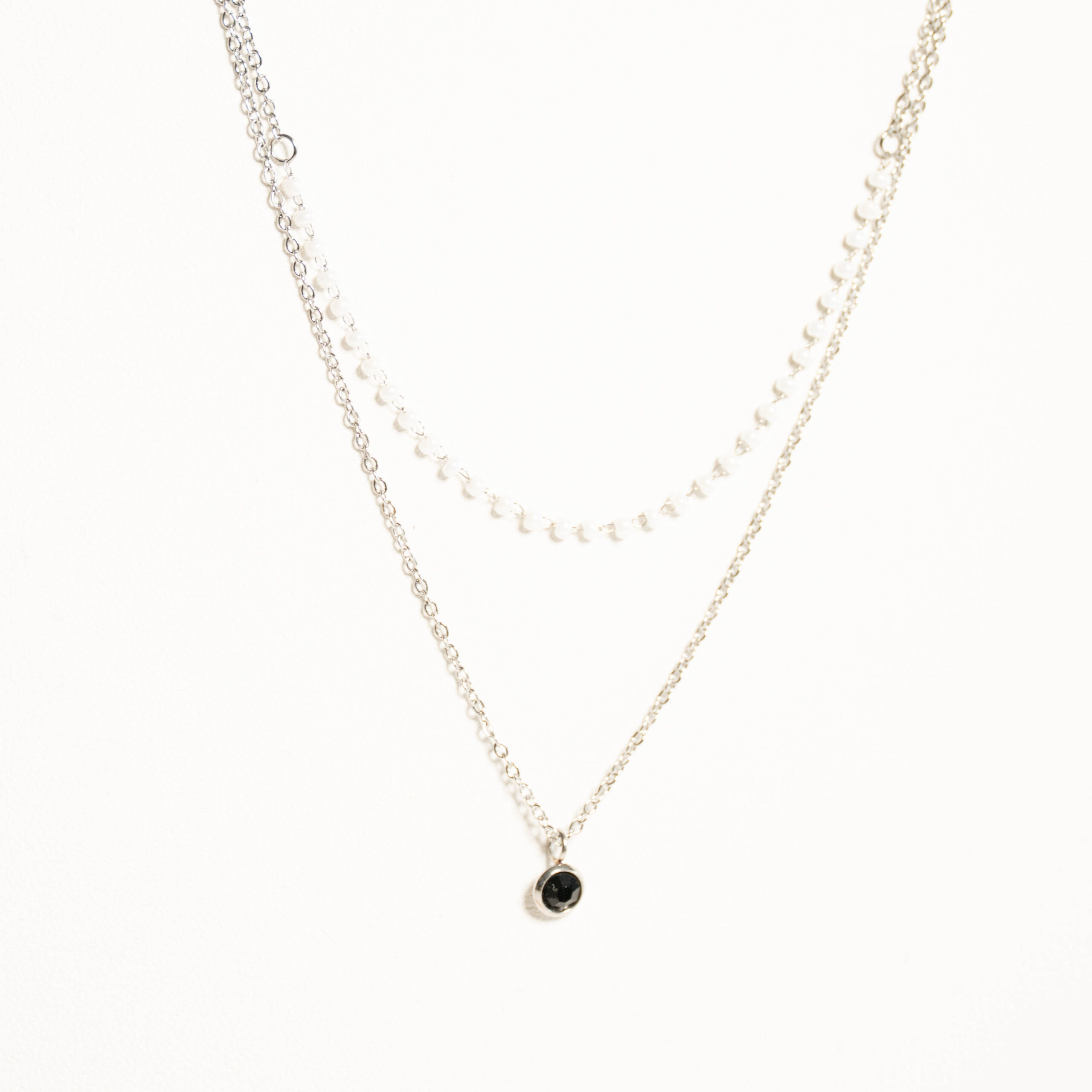 Podwójny łańcuszek z białymi koralikami i czarną okrągłą zawieszką